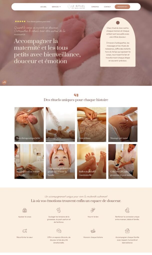 - Un site qui raconte votre histoire : L’architecture et les visuels sont pensés pour transmettre votre valeur et créer du lien.